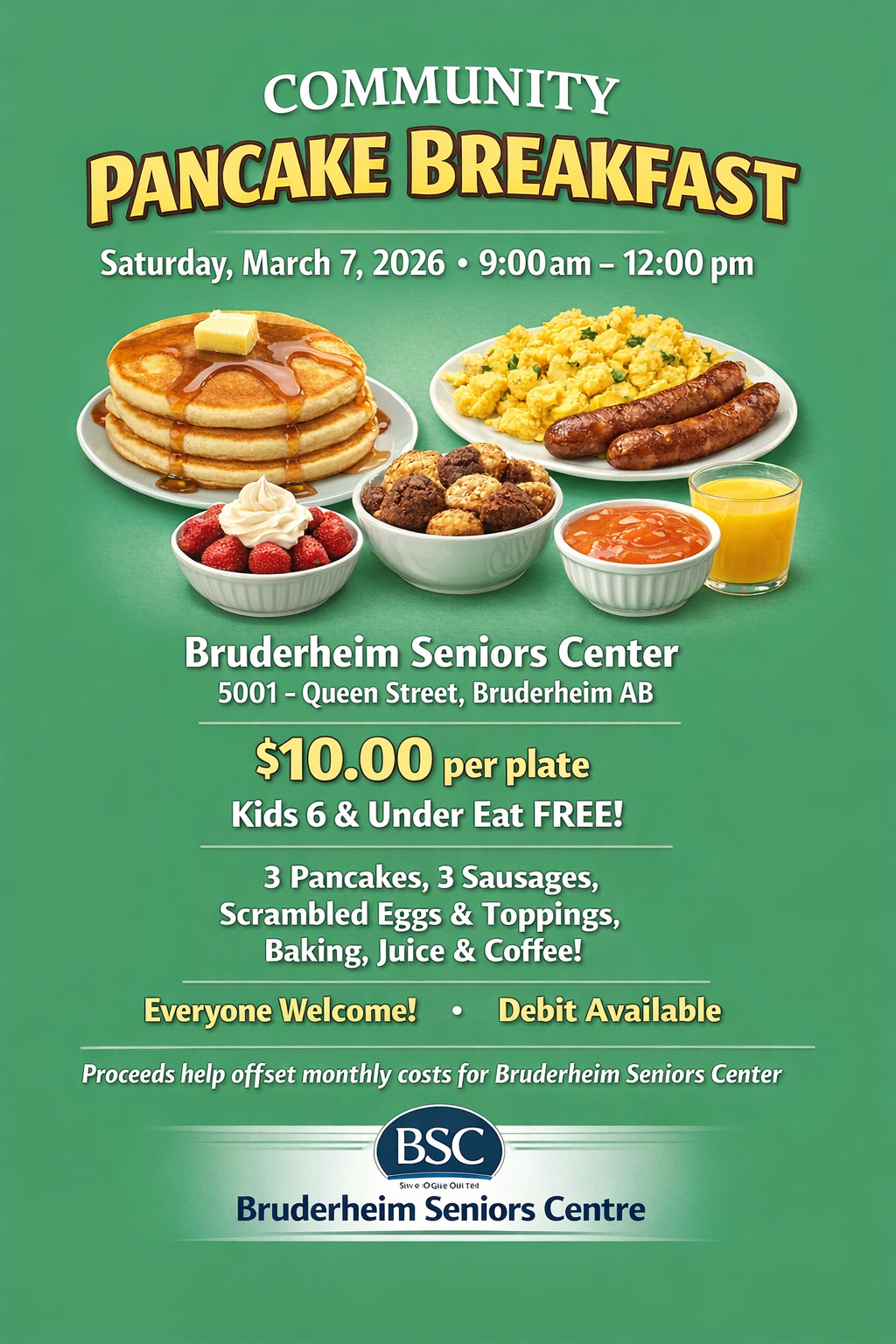 Bruderheim Seniors Pancake Breakfast When: Saturday, March 7, 2026 at 9:00 AM to Saturday, March 7, 2026 at 12:00 PM Community Please note the NEW TIME:9:00 a.m. to 12:00 p.m. Save to your calendar SHARE COPY