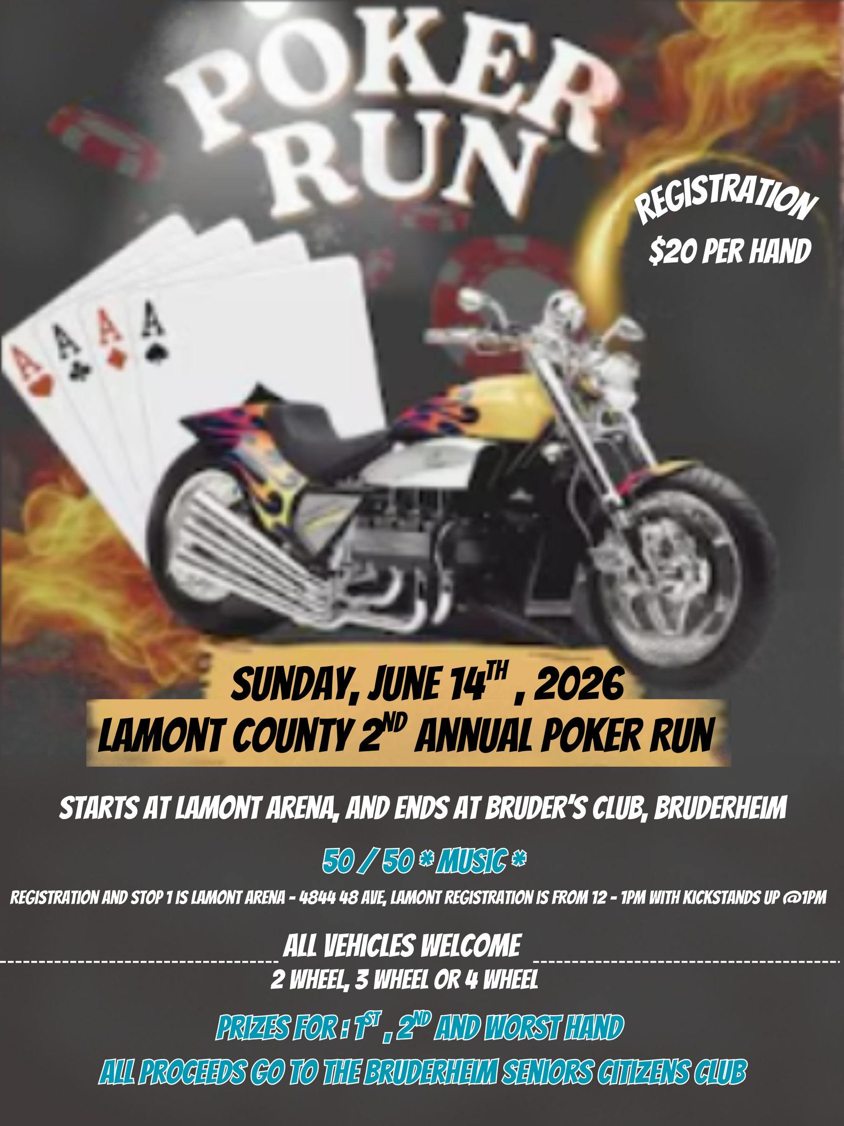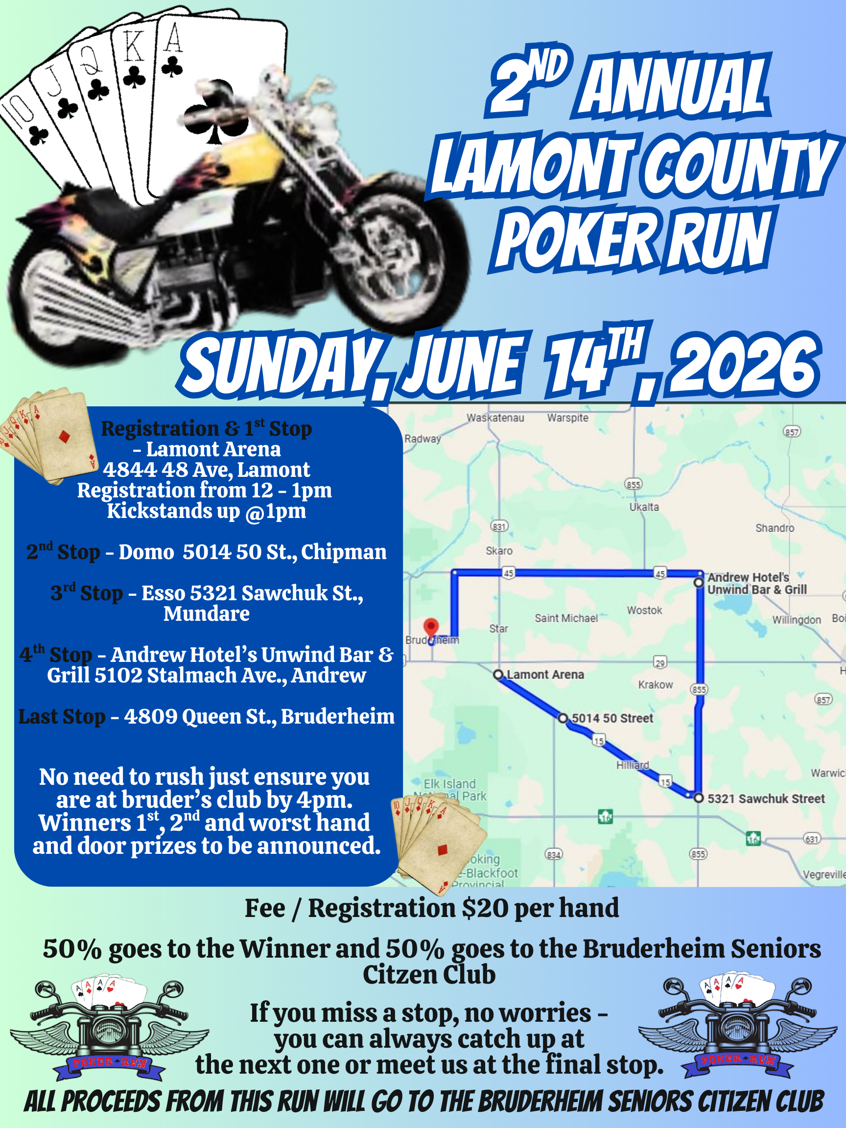 2nd Annual Lamont County Poker Run When: Sunday, June 14, 2026 at 12:00 PM Community For more information contact Jodie at Velt_j@hotmail.com Save to your calendar SHARE COPY
