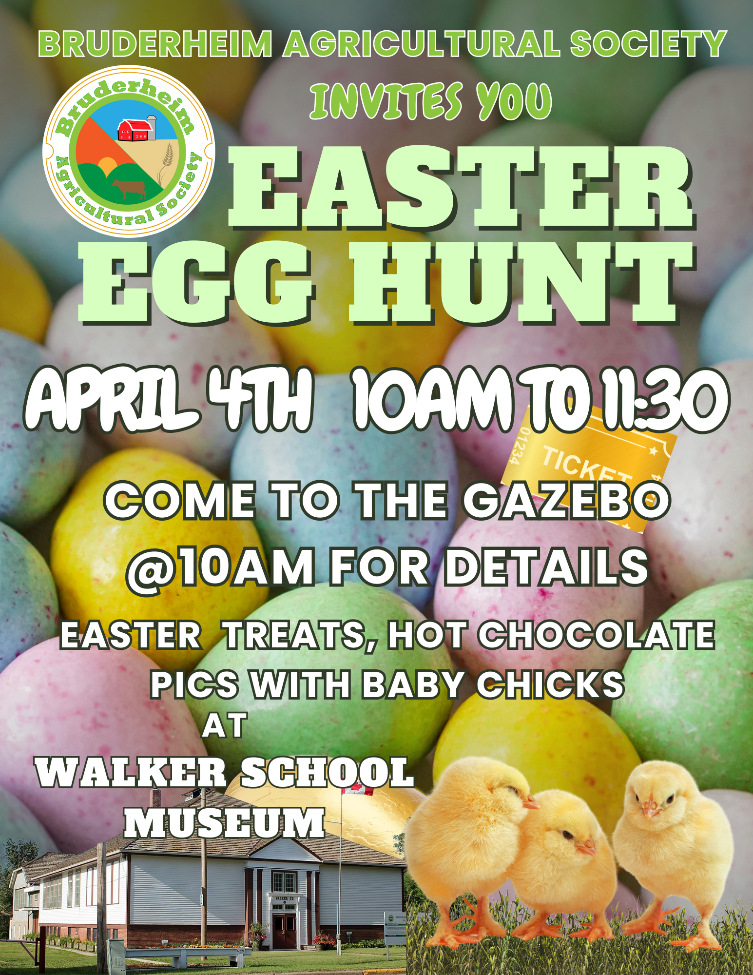 Easter Egg Hunt When: Saturday, April 4, 2026 at 10:00 AM to Saturday, April 4, 2026 at 12:00 PM Community Join the Ag Society at the Gazebo from 10:00 a.m. to Noon for their Easter Egg Hunt. Save to your calendar SHARE COPY